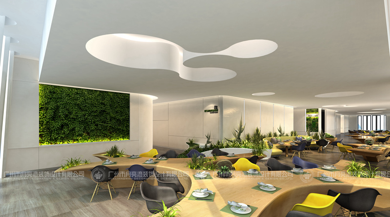 設(shè)計(jì)理念:大設(shè)計(jì)著重體現(xiàn)能源大廈的生態(tài)性,員工餐廳的設(shè)計(jì)對(duì)應(yīng)整個(gè)寫字樓,以及對(duì)周邊環(huán)境自我反饋,自我調(diào)節(jié)的特性。陽(yáng)光照入室內(nèi),燈光和投射設(shè)置開(kāi)始運(yùn)作,隨著陽(yáng)光的變化立面的植物墻暗藏led燈逐漸亮起,極富生機(jī),大片植物加入,如在森林中進(jìn)餐,美妙極了。